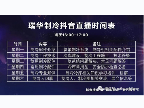 2022年瑞華制冷快速打造了直播團隊及直播室,采購了專業(yè)設備,為大家講解制冷知識、氨氟制冷安全、制冷工程答疑等,以后每天16:00定時開播,每天一小時,與大家共同探討制冷相關問題,歡迎大家關注,抖音搜索“瑞華制冷”關注即可進入直播。